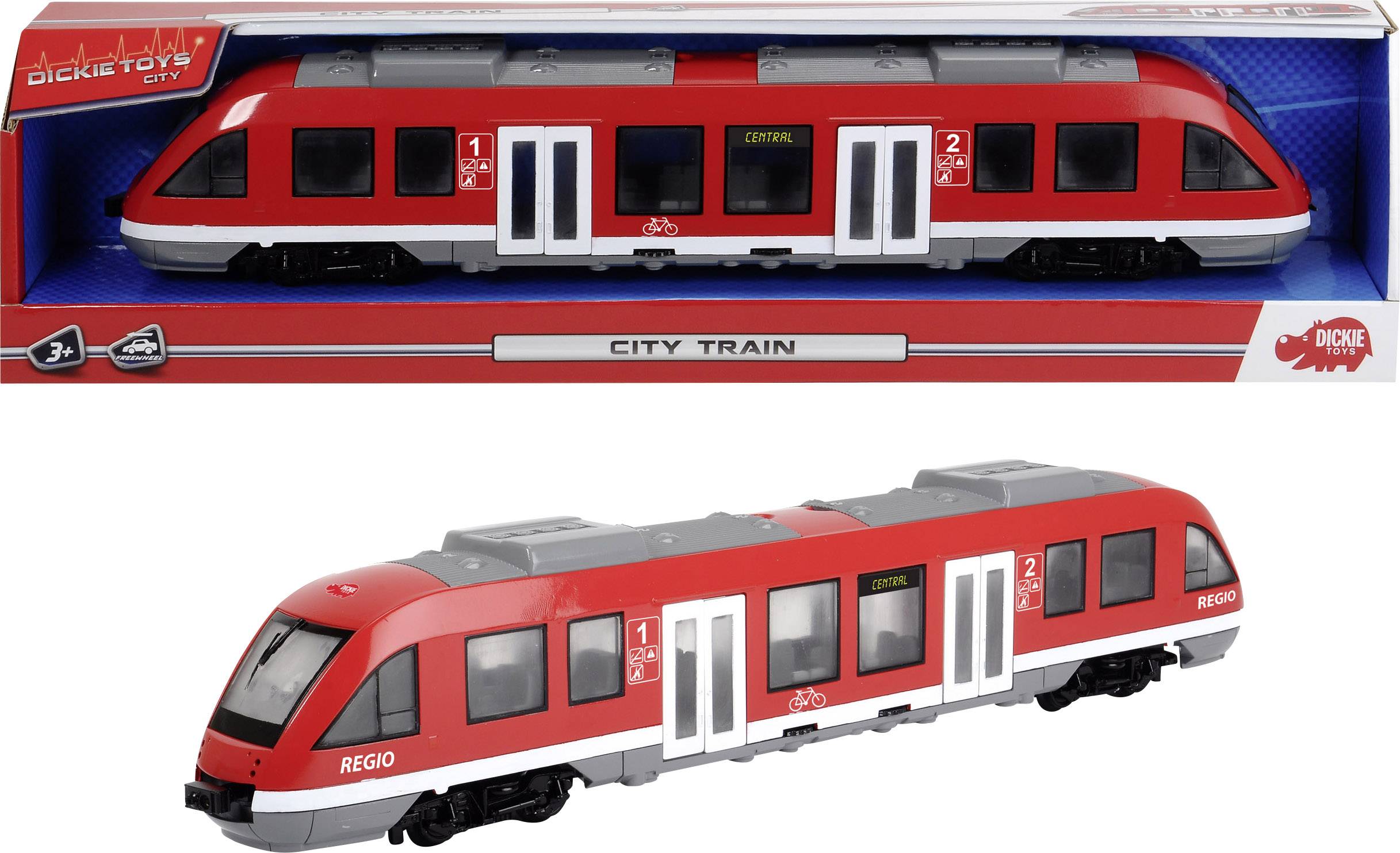 Dickie Toys City Train: Die schlaue Art der Fortbewegung! Den Dickie Toys City Train sollte es eigentlich auch in der Realität geben. Statt auf Schienen fährt er auf Rädern mit Freilauf und kommt so überall dorthin, wo die Fahrgäste der Spielzeugstadt ankommen möchten. Ansonsten hält sich die Nachbildung jedoch an die großen Vorbilder auf Schienen. Dach und Türen lassen sich öffnen, sodass Kinder einen Blick auf das detailliert ausgestaltete Interieur werfen und sich die einzelnen Elemente eines Regionalzugs einmal aus der Nähe anschauen können. Mit 45 Zentimetern Länge ist der Zug auch im Regal ein richtiger Hingucker und wird so zum begehrten Sammlerobjekt für ältere Schienenfans.