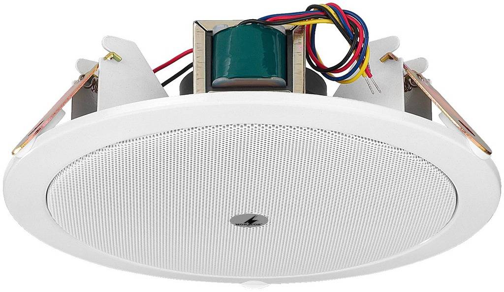 ELA-Deckenlautsprecher · 100-V-Übertragungstechnik durch Audio-Übertrager mit Leistungsanzapfungen · Für Deckenstärken 5-22 mm · 180er-Breitbandlautsprecher · Druckvoller in der Wiedergabe des Grundtonbereichs · Robuste Metallausführung (Korb und Schutzgitter)
