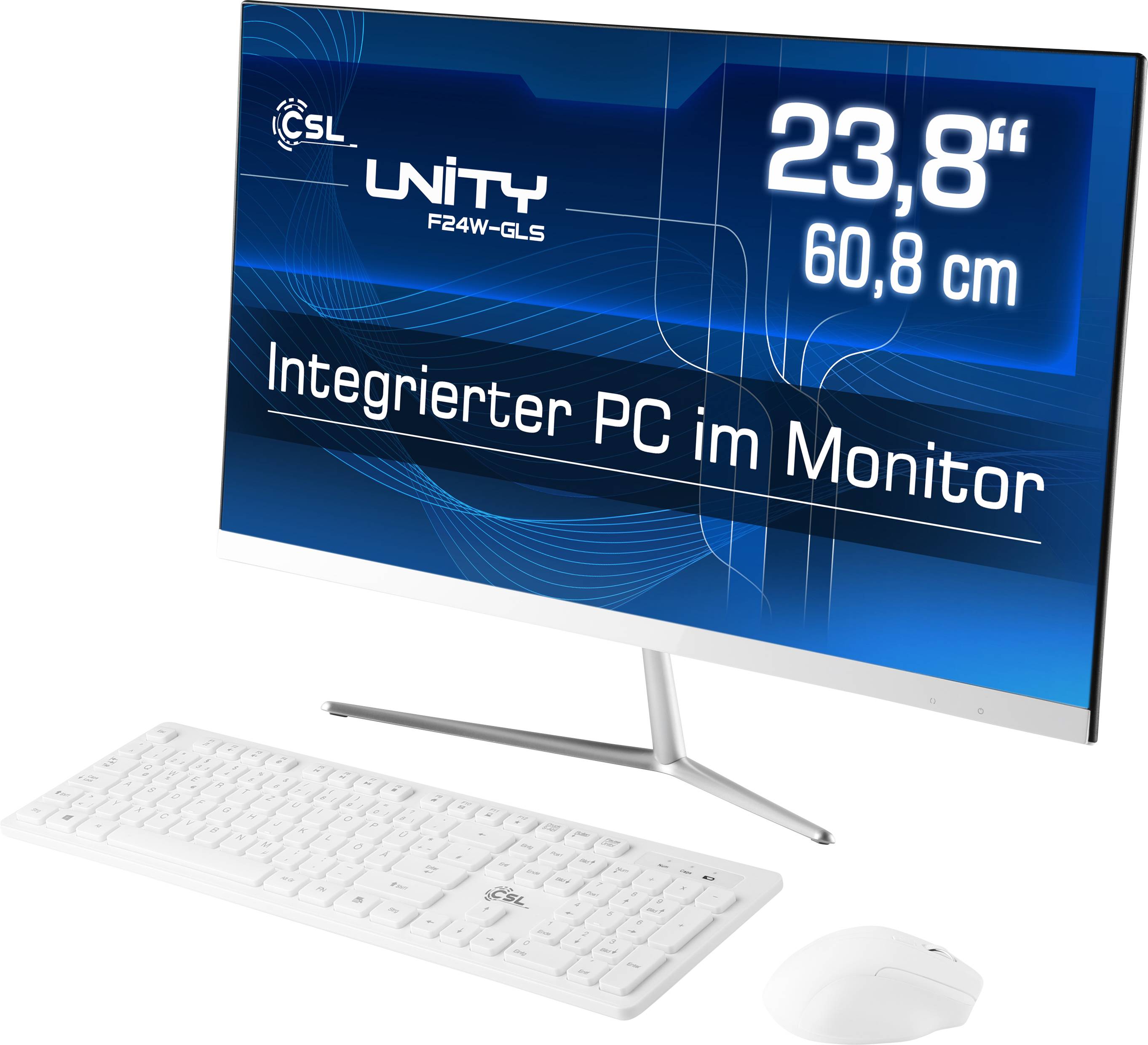 Ein starkes All-In-One-System zum Surfen, Arbeiten und Streamen! Der All-in-One-PC CSL Unity F24W-GLS / 512 GB / 16 GB RAM / Win 10 Home vereint ein komplettes PC-System im eleganten UltraSlim-Gehäuse mit integriertem 24" Full HD IPS-Display – schlank, leistungsstark und mit allen Anschlüssen, die Sie benötigen. Das innovative, passive Kühlsystem garantiert einen absolut lautlosen Betrieb, perfekt für ungestörtes Arbeiten und entspannte Filmabende.