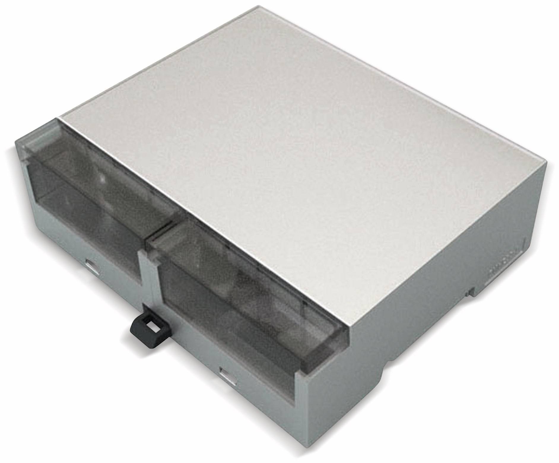 Hutschienengehäuse für Arduino Yun passt für DIN-Schienen nach EN 60715 TH35, geeignet auch zur Wandmontage. Das Gehäuse verfügt über Aussparungen für alle Schnittstellen des Arduino Yun Embedded Boards und bietet Raum für zusätzliche Elektronik. Der obere Teil des Gehäuses hat eine Vertiefung für eine Dekorfolie oder Aufkleber. Im Lieferumfang des Gehäuses enthalten eine Klemmenabdeckung und einen Montagesatz für Leiterplatte Arduino Yun. Technische Daten: - Material: flammwidriger Kunststoff ABS-PC Blend, brandklassifiziert nach UL 94 V-0 - Farbe: Lichtgrau (RAL 7035) - Oberfläche: Matt