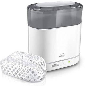 Dank seiner anpassbaren Größe passen die Artikel, die Sie sterilisieren möchten, perfekt in diesen Philips AVENT 4-in-1-Sterilisator. Außerdem nimmt er dadurch nur wenig Platz in der Küche ein. Die 4-in-1-Funktion bietet Ihnen: 1) Kleine Größe zum Sterilisieren von Beruhigungssaugern 2) Mittlere Größe zum Sterilisieren von Milchpumpen sowie von Tellern, Messern und Gabeln für Kleinkinder 3) Große Größe zum Sterilisieren von bis zu 6 Flaschen 4) Integriertes Spülmaschinenkörbchen für eine mühelose Reinigung von Flaschen und Zubehör.
