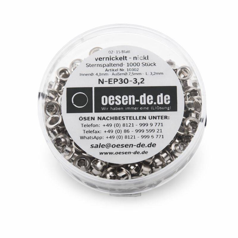 - Inhalt: 250 Ösen MEP30 – 3,2 mm, vernickelt