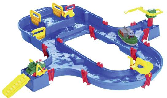 Wilma, das Flusspferd ist mit dem Amphibienfahrzeug unterwegs zum Fähranleger. Dort angekommen geht es über die Auffart mit der Fähre in das Kanalsystem. Und weiter geht es, der Weg führt durch die Schleusenanlage zur Hafenstation, wo die Container auf das Containerboot umgeladen und weiterverschifft werden. Ein klassisches Set mit allem, was man zum Spielen braucht. Durch das Drehen des Paddelrades fließt das Wasser durch den Kanal und die Strömung für die Bewegung wird erzeugt.