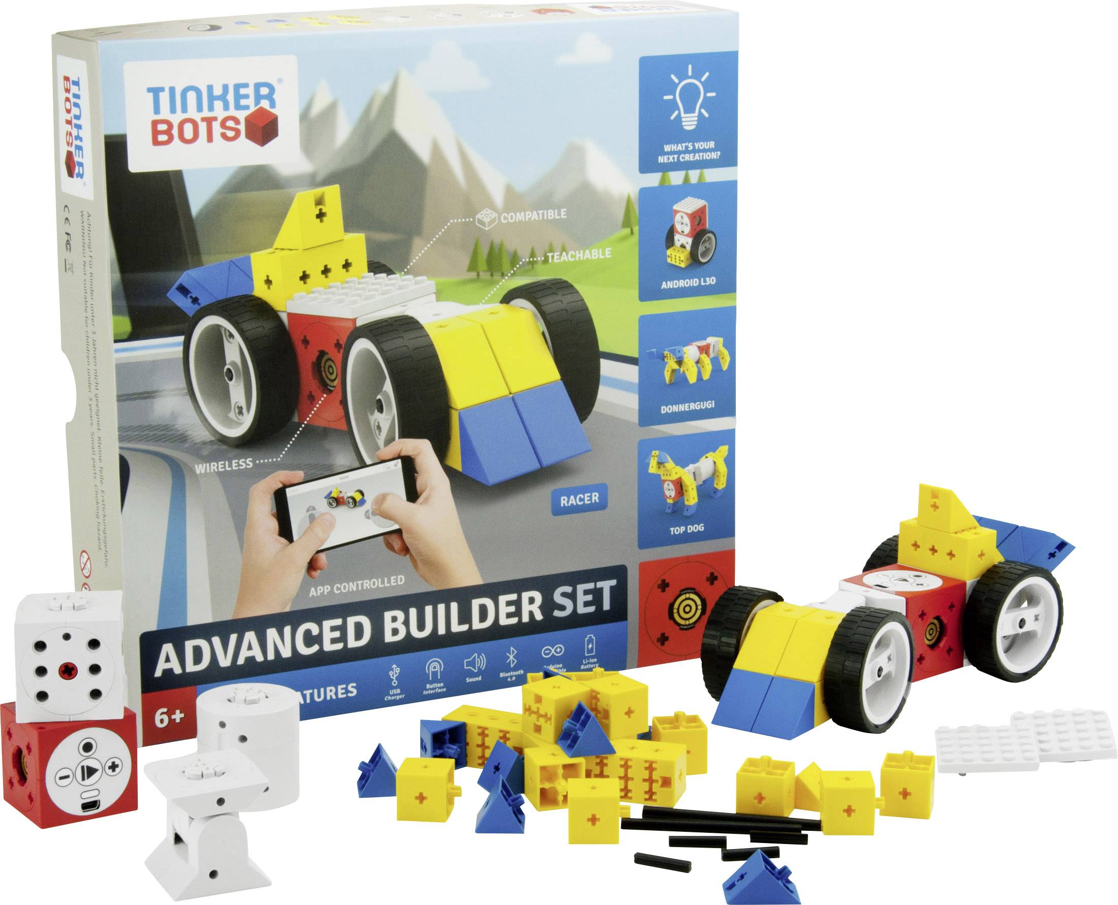 Das Advanced Builder Set bietet eine Einführung in die innovative und spannende Welt von Tinkerbots®. Mit dem Robotik-Baukasten können Kinder ab 6 Jahren coole Roboter-Tiere, Monster, Fahrzeuge und Maschinen bauen. Einfach das Powerbrain mit den unterschiedlichen Bewegungsmodulen wie dem Twister oder Pivot verbinden und Cubie-Bausteine für die einzigartige Form hinzufügen - schon ist der Roboter fertig. Alle Teile lassen sich ganz einfach zusammenstecken, Löten oder Kabel verbinden ist nicht nötig. Mit dem Advanced Builder Set lassen sich Kreationen zum Leben erwecken, ihnen über die Record & Playback-Funktion Bewegungen beibringen, per App (iOS und Android) fernsteuern oder über Arduino selbst programmieren. Cubies und Module lassen sich zudem mit LEGO® und weiteren Tinkerbots®-Modulen erweitern.