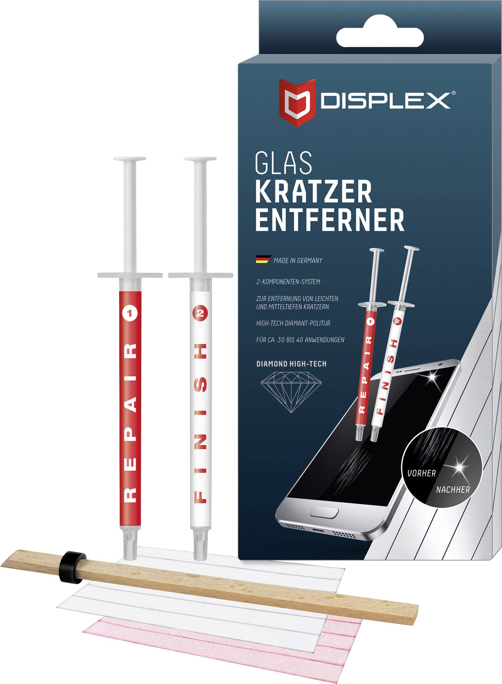 Mit dem Glas-Kratzer-Entferner von DISPLEX können Kratzer aus Glas-Displays von Smartphones einfach und zuverlässig entfernt werden. Damit wird die Optik, die Funktion und nicht zuletzt der Wert der elektronischen Geräte wieder hergestellt. Dies spart viel Geld, denn es kann meist auf den teuren Austausch von Display-Gläsern verzichtet werden.