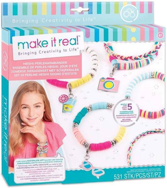 Set zum Herstellen von trendigen Armbändern. Inhalt: 480 Heishi-Perlen, 35 silberne Perlen, 1 Elastikschnur (2 m), 1 großer Metallring, 1 kleiner Metallring, 1 Karabinerverschluss mit Bindering, Stickgarn in 6 verschiedenen Farben (je 2 m), 3 Anhänger, 1 Einfädler, Basteltablett und Anleitung. Make it Real Make it real hat die Mission Kreativität zu entfachen und die Fantasie anzuregen. Mit Ihrem vielfältigen Programm holt man die Ideen in die Realtät. Vom Scratchbook bis zum Nageldesign - Make it Real bietet eine große Auswahl.