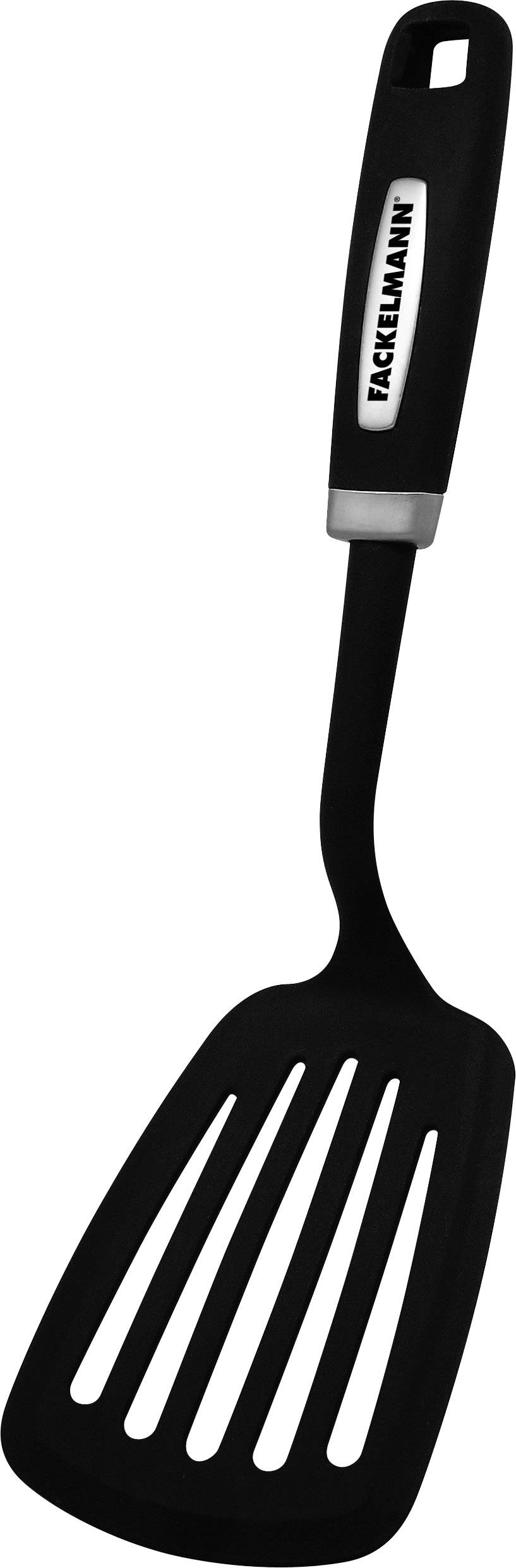 Die neue Haushaltshelfer-Serie FEEL von FACKELMANN besticht durch ein hochwertiges, elegantes und modernes Design. Dieser Effekt stellt sich besonders durch eine Kombination aus schwarzen und silberfarbenen Elementen bei Griff und Funktionsteilen ein. Der schwarze Soft-Touch-Griff besteht aus einem rutschfesten, äußerst langlebigen Kunststoff. Ergonomisch designt, liegt er perfekt in der Hand und erfährt durch eine Edelstahl-Kappe und das integrierte, markante Serienschild eine zusätzliche Aufwertung.Das Funktionsteil ist aus hitzebeständigem Nylon mit dem sich auch in beschichteten Pfannen oder Töpfen kratzfrei arbeiten lässt