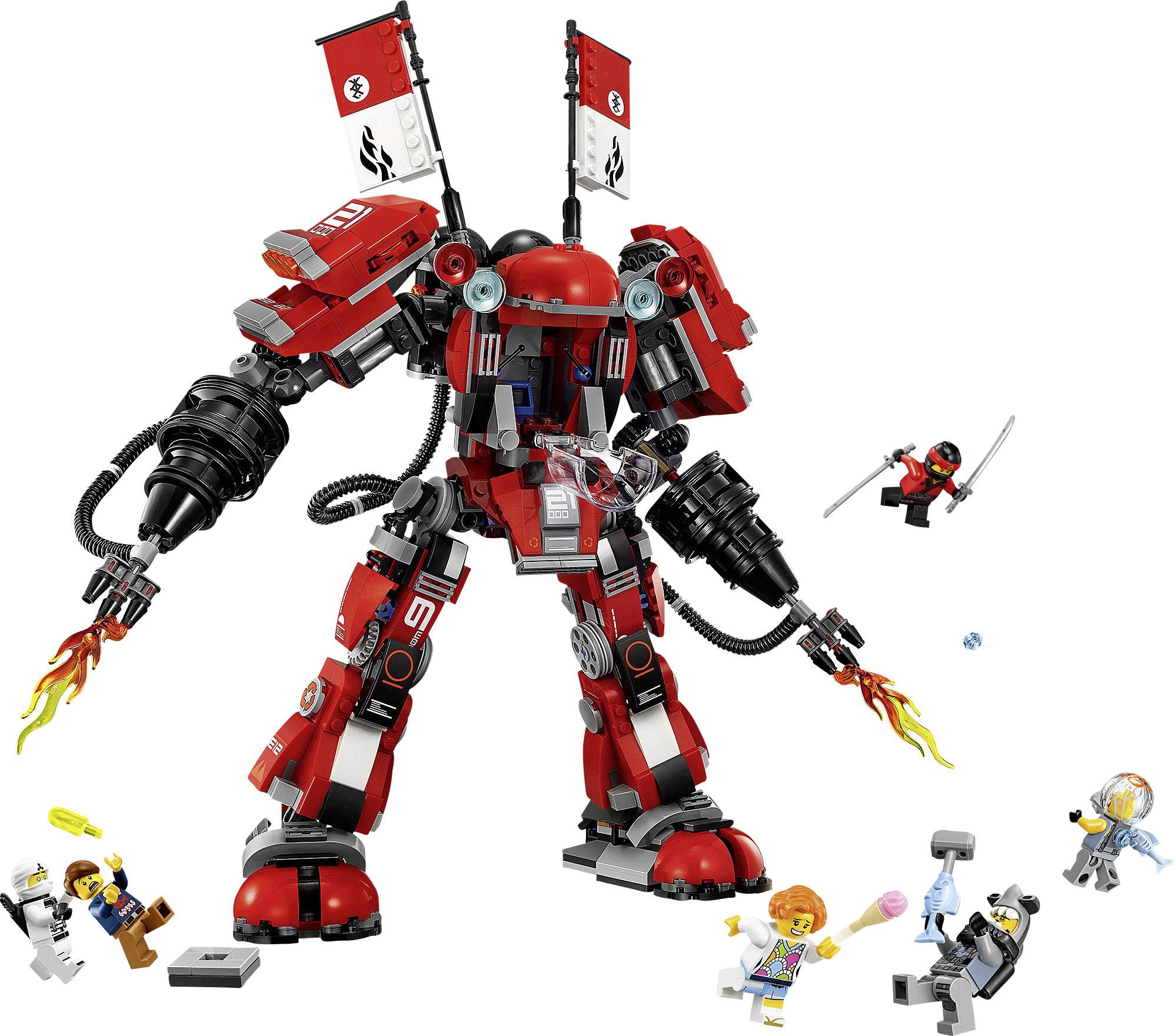 Mach dich auf brandheiße Action mit diesem riesigen und äußerst beweglichen Mech aus THE LEGO® NINJAGO® MOVIE™ gefasst. Der Feuer-Mech verfügt über ein aufklappbares Minifiguren-Cockpit, 2 Scheibenwerfer auf den Schultern und 2 Arme mit Flammenwerfer-Elementen. Enthält 6 Minifiguren mit unterschiedlicher Ausrüstung – so zum Beispiel auch die 2 Katanas von Kai und Zanes Pfeil und Bogen –, um noch mehr spannende Rollenspiele zu ermöglichen.