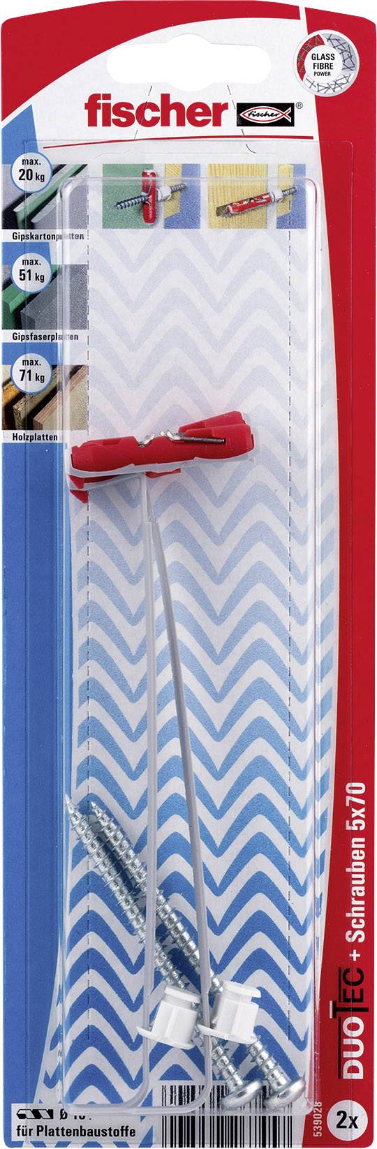 Der fischer Polyamid-Kippdübel DUOTEC für hohe Zug- und Querlasten durch 2 Komponenten. Einfache Montage mit geringem Bohrlochdurchmesser von 10 mm und kurzem Kippelement auch in engen und gedämmten Hohlräumen. Einfache Vormontage, der Dübel fällt auch ohne Schraube nicht in das Bohrloch. Kein Einschneiden und damit Schwächung der Gipskartonplatte. Das Kippelement klappt hinter der Platte automatisch auf und gibt ihm seine Tragkraft. Durch die flexible Schraubenaufnahme aus rostfreiem Stahl kann der Kippdübel mit Holz- und Spanplattenschrauben oder metrischen Haken- und Gewindestangen mit Kontermutter verwendet werden. Bei Bohrlochtreffern in Vollbaustoffen funktioniert er wie ein Spreizdübel. Der mitgelieferte Schraube mit Panhead ist optimal auf den fischer Kippdübel DUOTEC abgestimmt. Dies garantiert perfekten Halt.