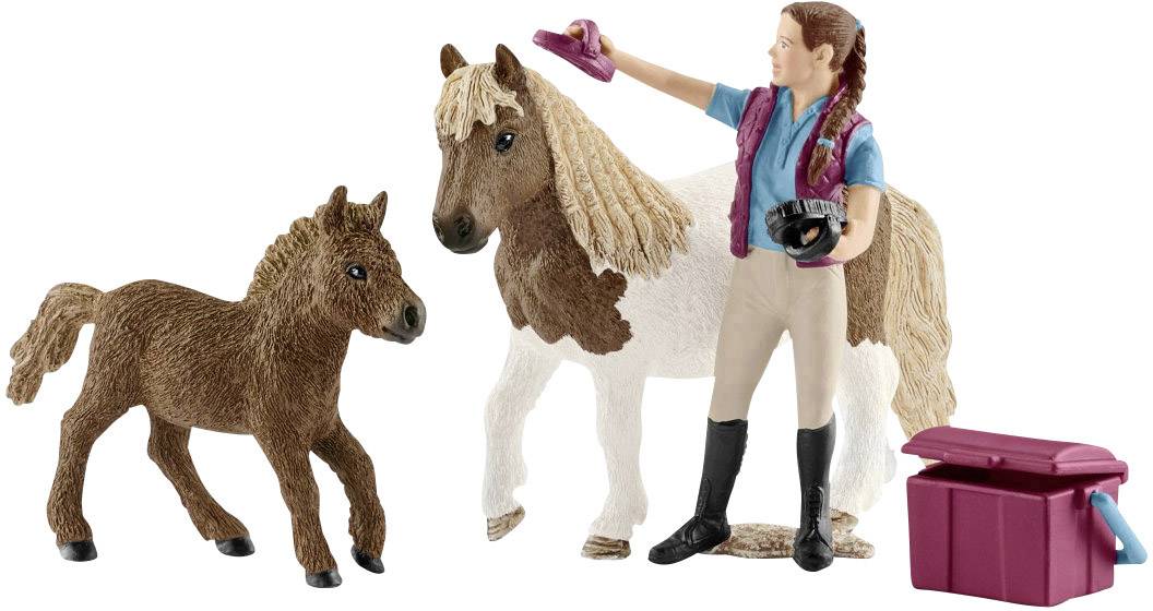 1 x Shetland Pony Stute + 1 x Shetland Pony Fohlen + 1 x Pferdepflegerin + 1 x Kardätsche + 1 x Striegel, magenta + 1 x Putzkiste + 1 x Apfel, rot.