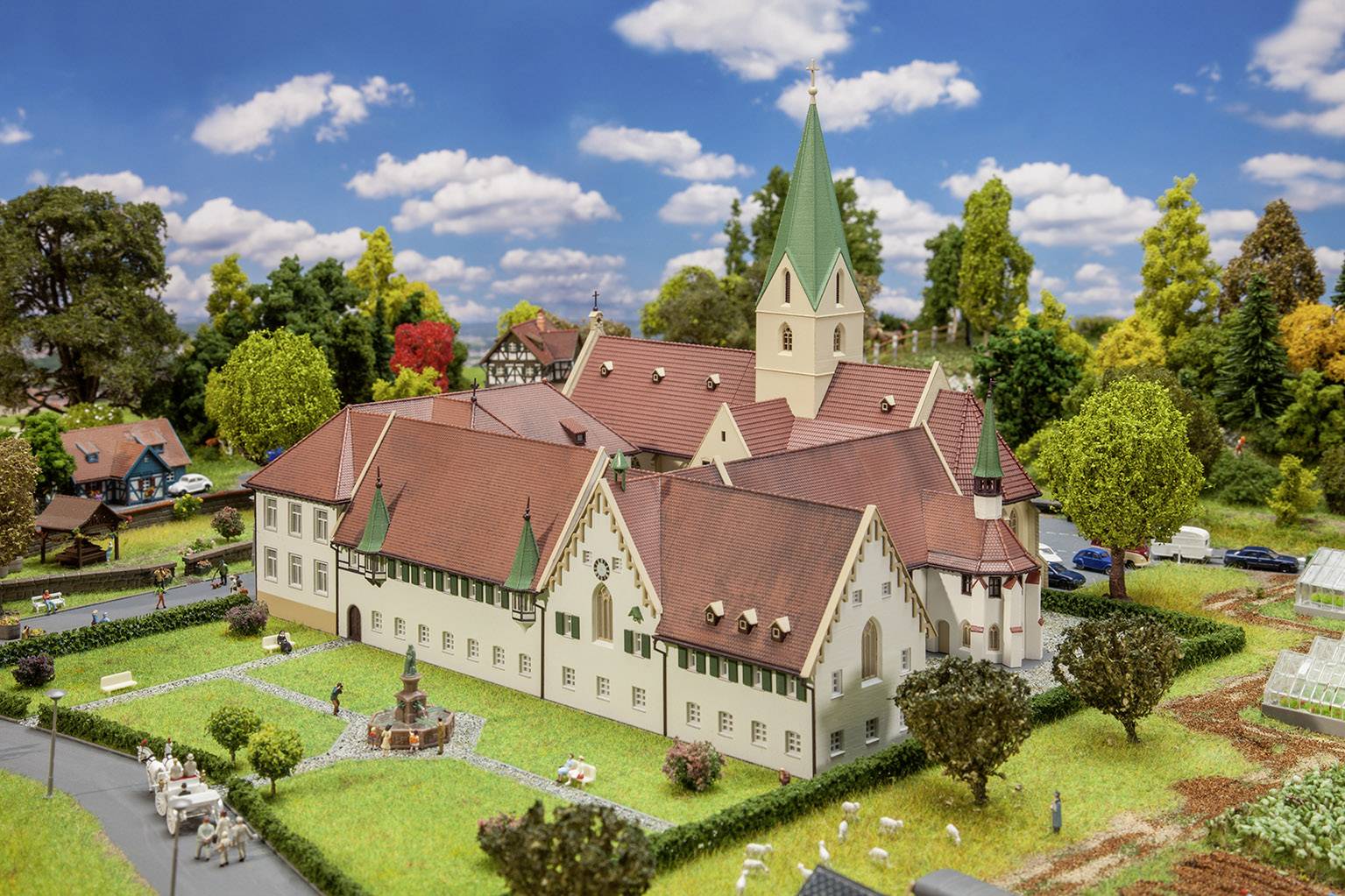 Klosteranlage in Anlehnung an das Originalvorbild des im 15. Jahrhundert erbauten, ehemaligen Benediktinerklosters und heutigen evangelischen Seminars von Blaubeuren, Württemberg. Der Wohn- und Schlaftrakt an der Ostseite, der Gästetrakt im Südflügel und die Abtei im Westflügel.