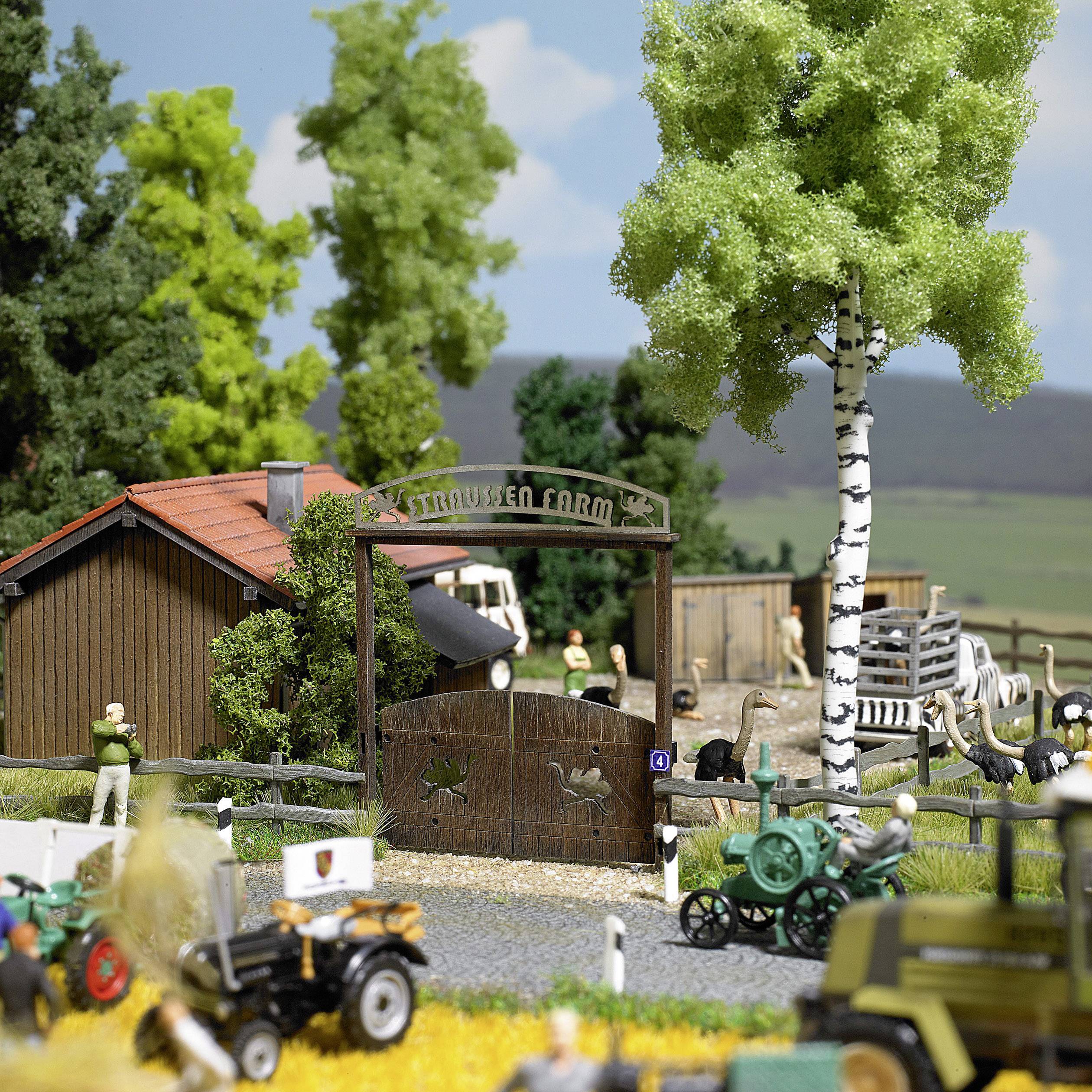 Bausatz für eine Straußenfarm nach einem Vorbild aus Altgernsdorf (Thüringen). Mit großem Holztor zum Öffnen (Breite: 50 mm) mit Straußen-Motiven und Beschriftung. Inklusive 4 Straußenfiguren, fertig bemalt. (2 x stehend, 1 x laufend, 1 x sitzend), 25 Straußeneiern und über 2 m Umzäunung.