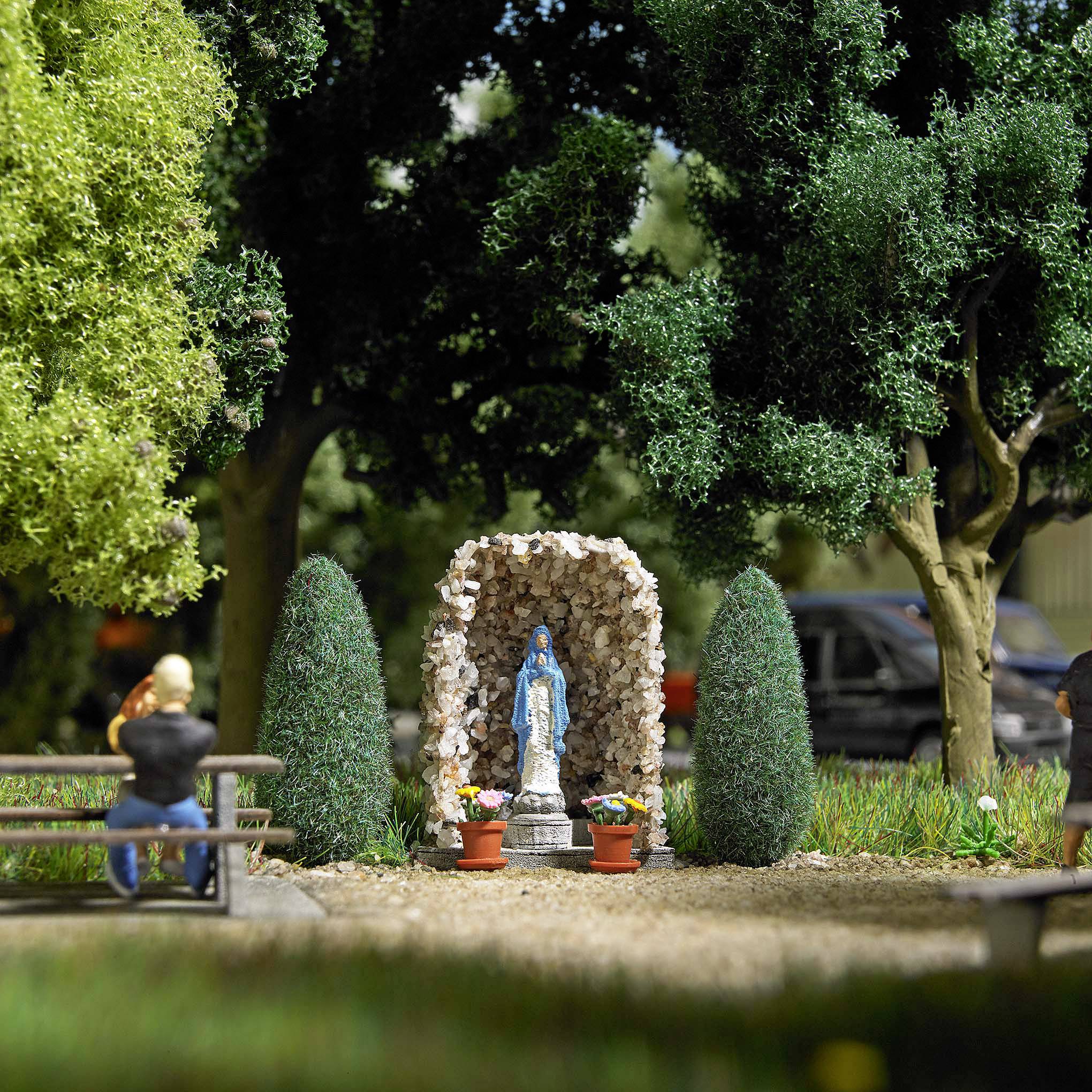 Steingrotte mit Marienfigur auf Steinsockel (Fertigmodell), zwei Sitzbänke und zwei Blumenkübel mit Bepflanzung (Bausatz).