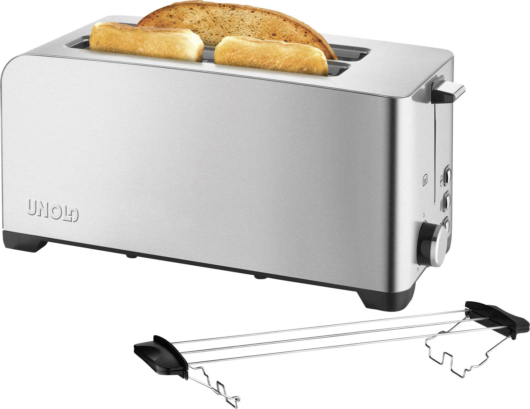 Da werden selbst Morgenmuffel zu Frühaufstehern: Denn mit dem Langschlitz-Toaster für vier Scheiben gelingt das Frühstück immer lecker-knusprig. Bei fünf einstellbaren Röstgraden gibt es für jeden Geschmack das Passende. Der UNOLD® Toaster mit hochwertigem Edelstahlgehäuse hat vier Funktionen (Auftauen, Aufwärmen/Nachtoasten, Toasten, Stoppen) und verfügt über eine automatische Zentrierung der Brotscheiben, einen Brötchenaufsatz sowie eine entnehmbare Krümelschublade.