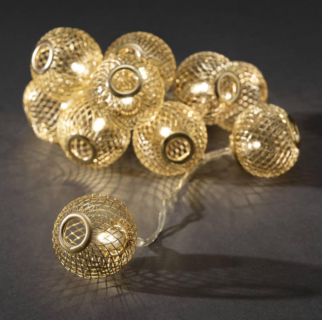 Goldfarbene Metallkugeln · 10 Warm Weiße Dioden · Batteriebetrieben (3x AA exkl.) · Innen · Transparentes Kabel.