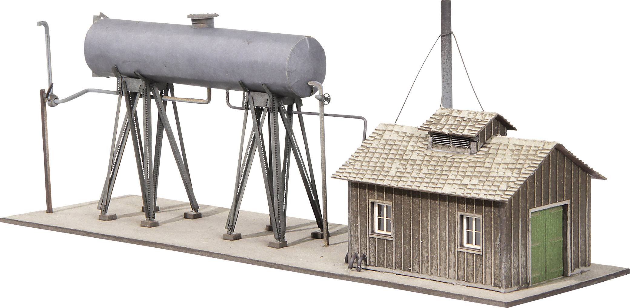 Dieseltankstelle, Öltankstelle mit Öltank, Ölkran und Heizhaus. Bausatz aus Karton lasergraviert und -geschnitten. Unbemalt.
