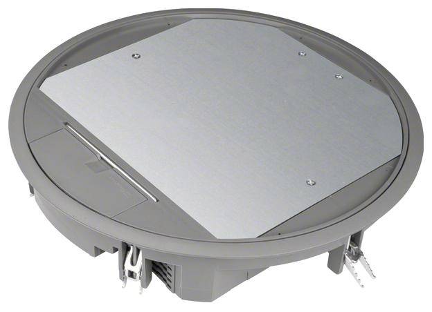 Versorgungseinheit R12 rund 306mm für 5mm Bodenbelag aus Polyamid eisengrau. Versorgungseinheit nach DIN EN 50085-1 und DIN EN 50085-2-2, inklusive Universal-Befestigungsset, mit Belagschutzrahmen, Gerätebecher stufenweise bis 18 mm absenkbar, mit Anschlussmöglichkeit für Flachkette.