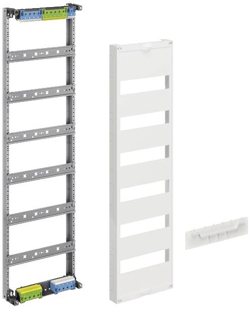 Verteilerfeld, univers Z, Höhe 900mm, 6-reihig, 1-feldig, PE/N waagerecht. Innenausbau für Verteilerfelder Einbausätze für Verteiler nach Maßnorm DIN 43 870 zum Einbau in Zählerschränke System univers Z zur Stromkreisverteilung. Bestehend aus 250 mm breiten Feldern mit Traggerüst aus profiliertem Stahlblech Verteilerfelder im Rastermaßsystem mit Hutschienen 35x7,5 mm und fingersicheren PE/N-Klemmen in Stecktechnik. Abdeckhaube aus Kunststoff Höhe 300 mm oder 450 mm zur Einhaltung der Schutzisolierung, Schutzart und Berührungsschutz. Alle Hauben mit Plombierschieber zur Plombierung, integriertem Griff und 46 mm Geräteschlitz mit je 12 Platzeinheiten pro 150 mm Rasterns. Die Felder sind mit einem Rastsystem ausgestattet, das einen schnellen und einfachen Schrankeinbau ohne Werkzeug erlaubt.