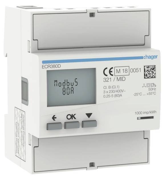 Energiezähler 3phasig, direkt 80A, 4M, MODBUS, MID. Energiezähler zur 4-Quadrantenmessung mit folgenden Genauigkeitsklassen: Wirkenergie Class B nach DIN EN 50470-3, Wirkleistung Class 1 nach IEC 62053-21, Wirkleistung Class 1 nach IEC 61557-12 und Blindleistung Class 2 nach IEC 62053-23. Der Zweirichtungszähler wird ab Werk MID zertifiziert (ein Plombierset im Lieferumfang enthalten) und enthält einen rücksetzbaren Teilzähler. Zur Messung von Energiebezug- und Energielieferung in allen Netzsystemen geeignet. Bis zu 8 Tarifzählungen möglich (2 Tarifzählungen über 230 V AC und Modbus, zusätzlich 6 Tarifzählungen über Modbus ansteuerbar). Digitales Display mit Beleuchtung zur Anzeige von bezogener und gelieferter Wirk- (kWh) und Blindenergie (kvarh) für alle Tarife. Zusätzlich werden je Außenleiter die Echtzeitmesswerte für Wirkleistung (kW), Blindleistung (kvar), Scheinleistung (kVA), Spannung (V), Strom (A), Leistungsfaktor, Frequenz (Hz) und Tarif in einer Auflösung bis zu 9 Stellen inklusive zwei Nachkommastellen angezeigt. Neben den zuvor genannten Messwerten können über Modbus auf die aktuellen Summen-Messwerte von Wirkleistung (kW), Blindleistung (kvar) und Scheinleistung (kVA) so wie den Leistungsfaktor zugegriffen werden. Außerden können die Werte des Teilzählers für Wirkenergie von jedem Tarif über Modbus einzeln zurückgesetzt werden. Endwiderstand (120Ohm ) zum Abschluss der Modbusleitung integriert. Alle Messwerte und Energiewerte für Tarif1 und Tarif2 können zusätzlich über eine IR-Schnittstelle ausgegeben werden. Verdrahtungsfehler und Anschlussfehler werden angezeigt und die Messdaten werden periodisches abgespeichert.