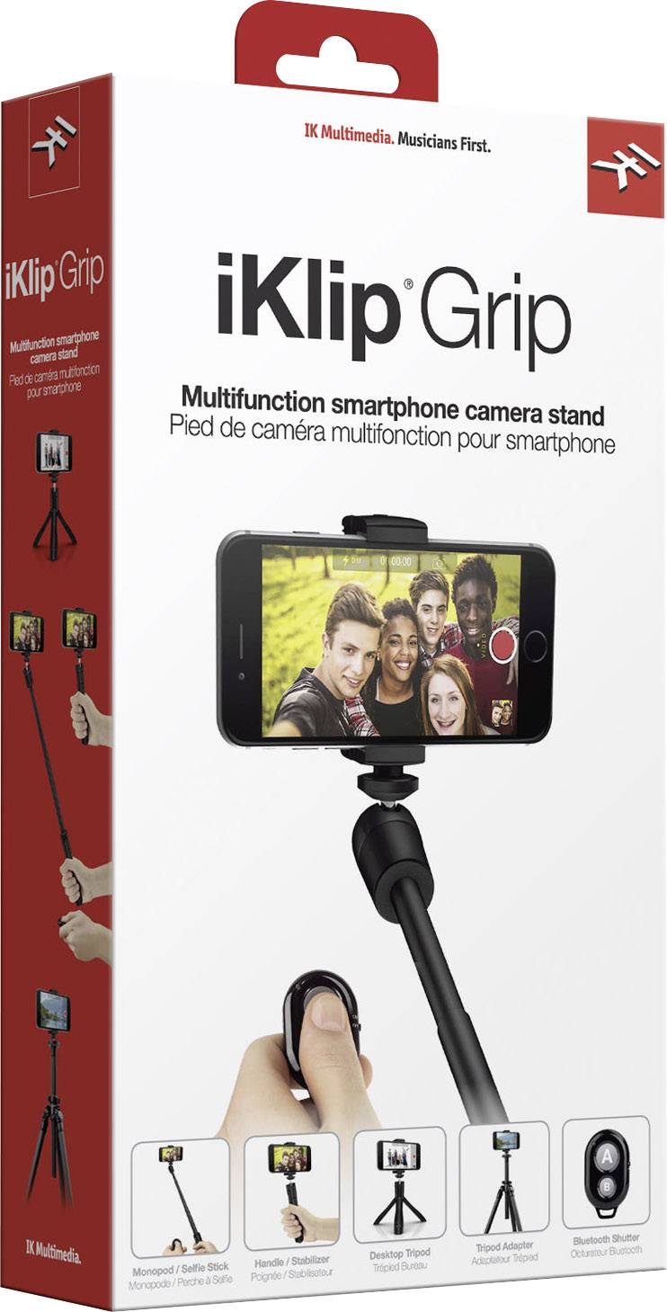 iKlip Grip ist eine clevere Kombination aus Selfie-Stick und einem kleinen Tripod-Stativ für Smartphones bis zu 6“, sowie für Geräte mit einem Standard Stativ-Anschluß (digitale Kameras, GoPros und Field-Recorder). Ebenso kann die Smartphone-Halterung des iKlip Grip an jedem Standard-Stativ befestigt werden, das damit als Smartphone-Stativ fungiert. Zum Lieferumfang gehört ein praktischer Bluetooth Fernauslöser.