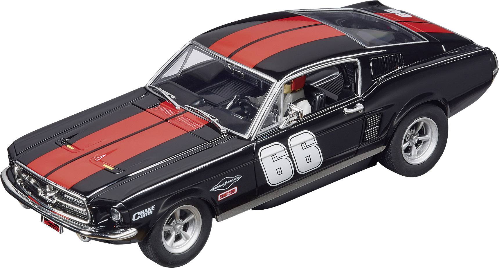 Dieses Modell des Jahrgangs 1967 unterscheidet sich optisch in einigen Punkten vom Serien-Mustang. Der Grilleinsatz des Mustang ist durch zwei mittig sitzende runde Zusatzscheinwerfer ersetzt worden, auf der Motorhaube befinden sich nun zusätzlich Verriegelungsstifte und Lufteinlässe. Das Motorenprogramm wurde um den 320 PS starken 6,4-Liter-Motor ergänzt. Das Design dieses Modells mit der Nummer 66 zeichnet sich durch eine schwarze Lackierung mit rotem Doppelstreifen auf Dach und Fronthaube, sowie durch rote Fahrersitze aus. Das Carrera DIGITAL 132 Ford Mustang GT "No.66" Slotcar begeistert durch Frontlicht und Rück- / Bremslicht sowie eine originalgetreue Verarbeitung. Das Carrera Auto ist individuell codierbar, digital steuerbar und bietet echten Fahrspaß.