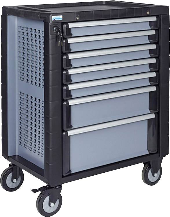 5 flache Schubladen Abm. 535 x 400 x 55 mm · 1 mittlere Schublade Abm. 535 x 400 x 125 mm · 1 große Schublade Abm. 535 x 400 x 195 mm · Seitenwände mit Schlüssellochung, dadurch können alle Küpper-Systemhalter verwendet werden! · 1 feststellbare Rolle · Schubladen mit Vollauszug und kugelgelagert · Zentralverriegelung · Schubladenschutzsystem, d.h. wenn eine Schublade geöffnet ist, lässt sich keine weitere öffnen · Abdeckung mit Unterteilung aus bruchfestem Kunststoff · Griffe mit Soft-Grip-Beschichtung für angenehmen und rutschfesten Halt ·