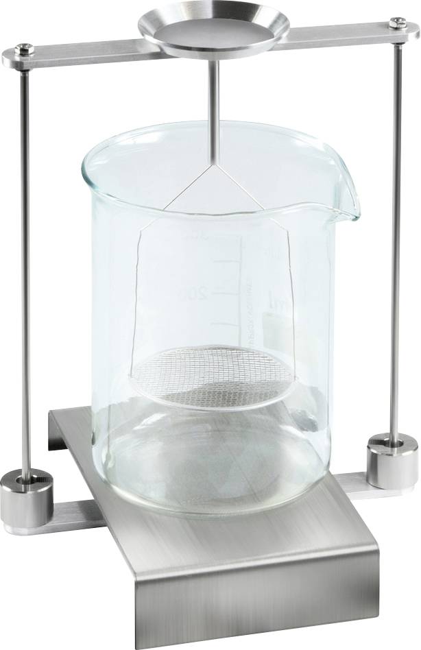 Lieferumfang: Becherglas, Thermometer, Probenhalter, Adapter, Ausgleichsgewichte, Senkkörper (Edelstahl, 20 g), Universal-Tauchkorb für schwimmende und sinkende Festkörper. Der Draht des Tauchkorbes hat einen Durchmesser von 0,5 mm und entspricht somit den Anforderung DIN EN ISO 1183-1 (Verfahren zur Bestimmung der Dichte von nicht verschäumten Kunststoffen)