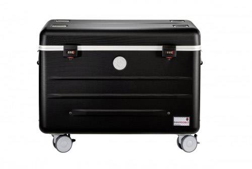 Außenschale aus schlagzähen gummierten X-ABS Kunststoff mit 3 mm Wandstärke in der Farbe Schwarz · Umlaufender Aluminiumrahmen an Deckel und Korpus · Einschubfächer aus „ConPearl®“ -Material · Bodenbereich des Koffers ist vollflächig mit Schaumstoff versehen · 4 x kugelgelagerte Leichtlaufräder (davon 2 mit Radfeststeller) · Teleskopauszug, 4-fach · beidseitige Tragegriffe · Kofferdeckel: diverse Fächer und Taschen · Korpus: Sync und Ladeeinheit, 16 Staufächer für Tablets, Staufach für Master Laptop und Staufach für Zubehör z.B. Access Point und Router · Zusätzlich Lüftungsöffnungen im Deckel und Bodenbereich für optimale Luftzirkulation · Temperatursensor (Überhitzungsschutz) · Programmierbarer, interner Ladetimer.