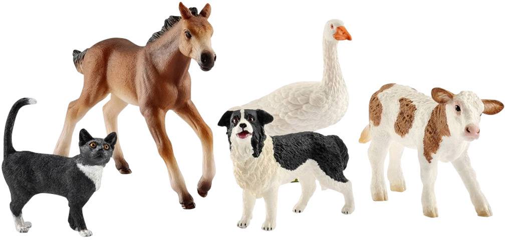 Dieses Set beinhaltet fünf Bauernhof-Tiere: Ein Fleckvieh-Kalb, eine Katze, einen Border-Collie, eine Gans und ein Mustang Fohlen. Auf dem Bauernhof sind ein Fleckvieh-Kalb und ein Mustang-Fohlen geboren worden. Sie sind noch etwas unsicher auf den Beinen, tapsen aber mutig über den Hof. Die Gans schnattert aufgeregt zur Begrüßung, und der Border Collie beschnuppert die beiden freudig, während die Katze das friedliche Bauernhofleben gemütlich von einem sonnigen Platz aus beobachtet. Die Schleich Figuren sind alle detailgetreu modelliert und liebevoll handbemalt.