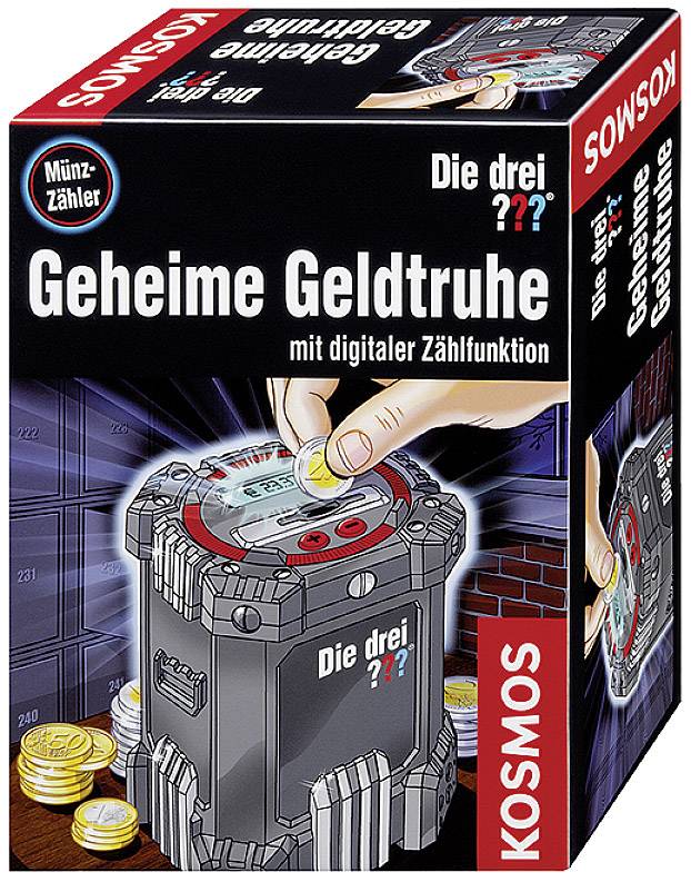 In dieser Geldtruhe ist das Ersparte der „Die drei ???“-Fans sicher verwahrt. Nur über einen geheimen Mechanismus kann sie geöffnet werden. Dank der Euro-Münzzählfunktion kann man gleich sehen, ob schon genug Geld für einen geheimen Wunsch angespart ist.