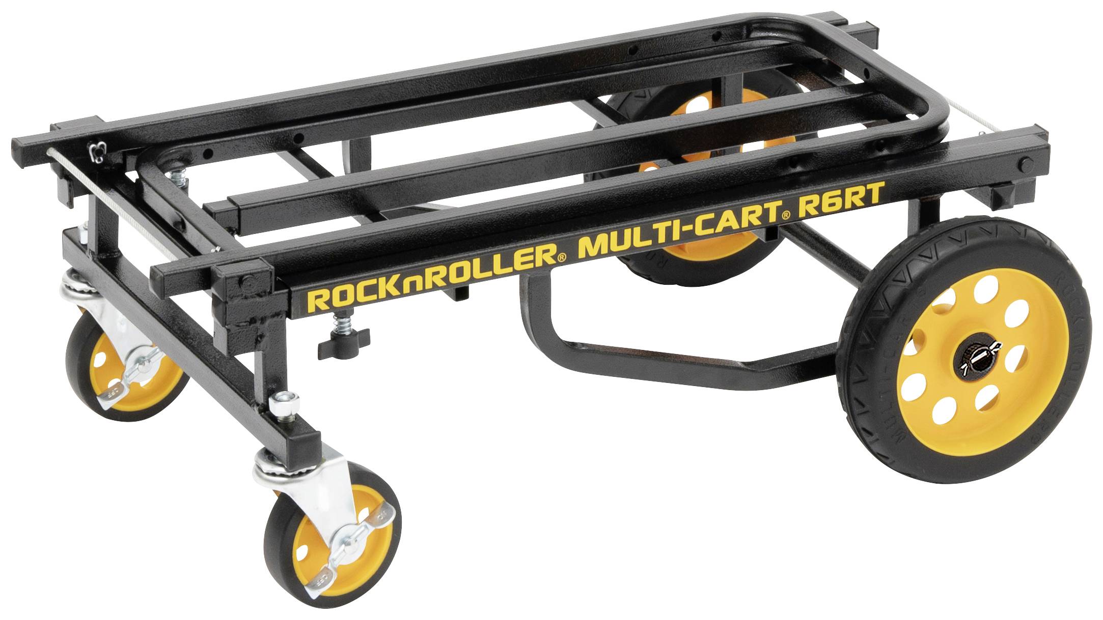 Der RocknRoller® Multi-Cart® R6RT verfügt über zwei robuste, schaumgefüllte 8-Zoll-Räder und zwei 4-Zoll-Lenkrollen, die den Transport von großem und schwerem Equipment erheblich erleichtern.