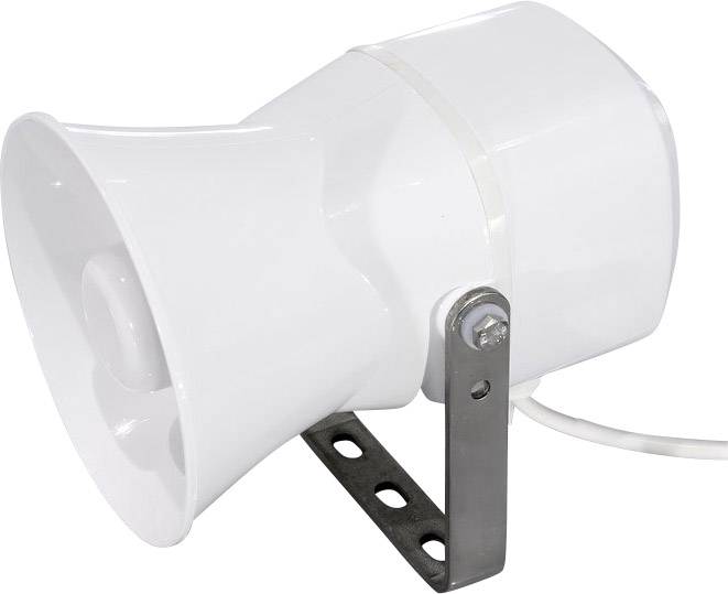 Druckkammerhorn-Lautsprecher mit 100-V-Übertrager. Kompakte Bauweise und wasserfeste Ausführung. Hoher Schalldruck und breiter Übertragungsbereich, dadurch hervorragende Sprachverständlichkeit. Schwenkbarer Metallbügel zur Befestigung an Decken, Wänden, Säulen usw.