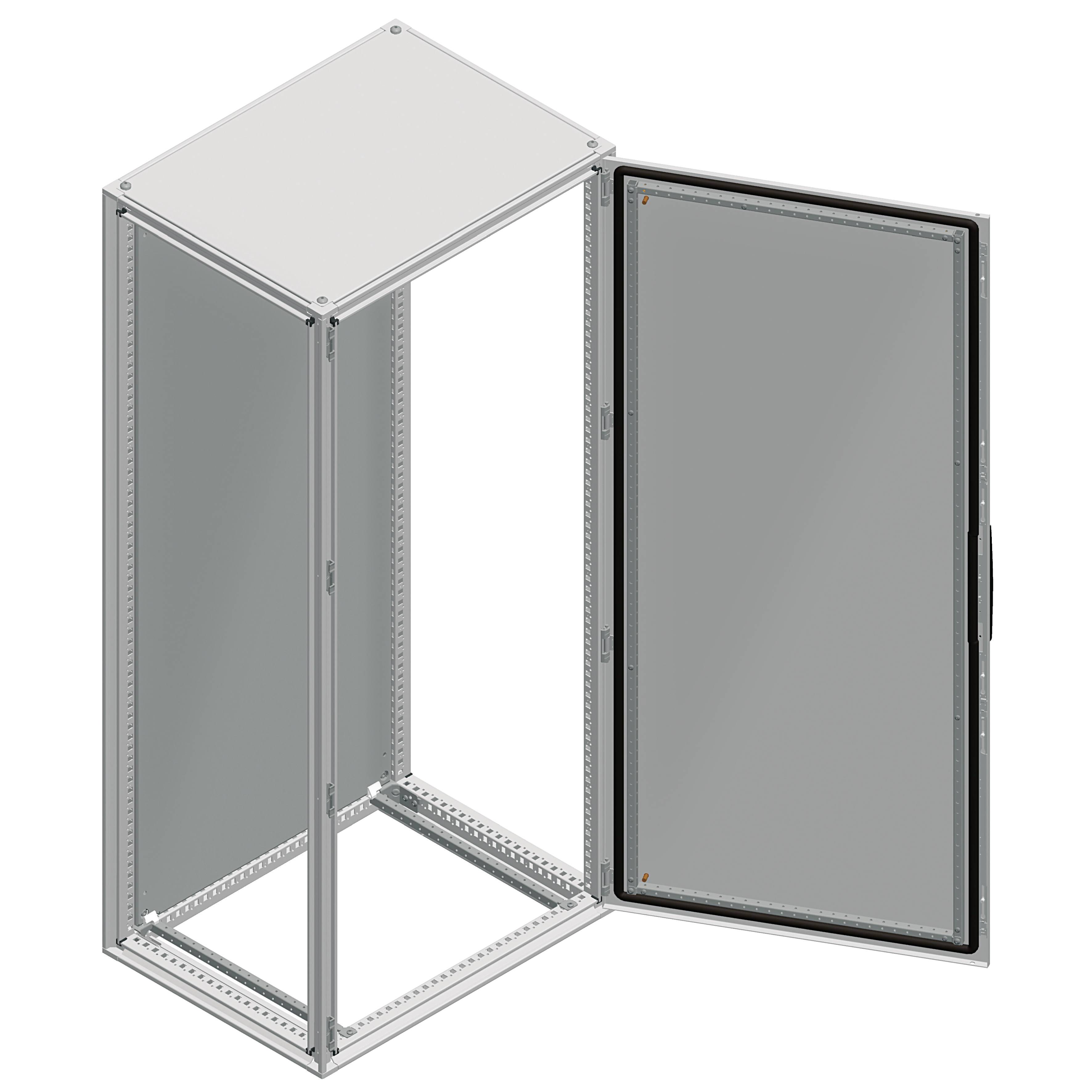 Spacial SF Anreihschrank Stahlgehäuse mit Volltür an der Vorderseite. 2000 x 600 x 600 x 600 mm. Montiert. Verschraubte Rückwand. Ohne Montageplatte. 4-Punkt-Verschlusssystem mit Griff und 5 mm Doppelbartschliessung. Verzinkter Stahl für Rahmen und Stützen. Schutzart IP 55, IK10, Farbe RAL 7035. Inklusive 4 Halterungen für die Montageplatte.