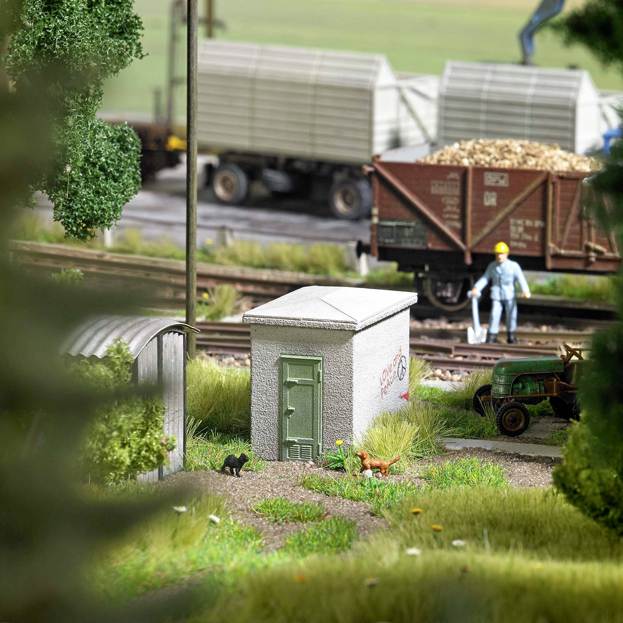 Schalthäuschen für Signalanlagen an Bahnübergängen. Mit den beiliegenden Ausschneidemotiven auch als Trafohäuschen und Fernmeldehäuschen einsetzbar. Mit passendem Geländer.