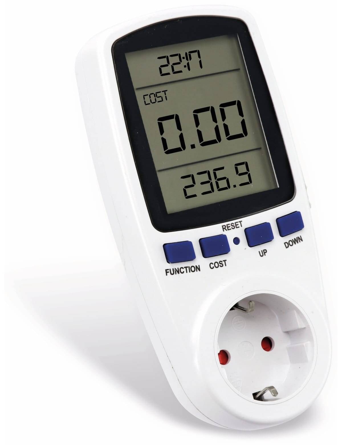 Mit diesem Messgerät behalten Sie Ihre Stromkosten immer im Auge. Das Gerät wird einfach zwischen Verbraucher und Steckdose gesteckt und rechnet anhand des frei einstellbaren Stromtarifs präzise die Kosten der angeschlossenen Verbraucher aus. Ideal um Stromfresser zu enttarnen! Features: - Großes, weiß beleuchtetes Display - Anzeige von Spannung, Stromstärke, Leistung, Frequenz, Leistungsfaktor, Überlast - Anzeige der Betriebsdauer, Kosten, Stromverbrauch und Betrag - mit erhöhtem Berührungsschutz - Programmierungserhaltung durch integrierten Pufferakku Technische Daten: - Betriebs-/Messspannung: 230 V~ - Strommessung: max. 16 A - Leistungsmessung: 0...3680 W - Verbrauchsanzeige: 0,00...9999 kWh - Energiekostenanzeige: 0,00...99,99 €/kWh - Kostenanzeige: 0...9999 € - Zeitanzeige: 0 s...9999 Tage - Messtoleranz: ±2 % - Maße mit Stecker (HxBxT): 158x73x75 mm Messbereiche: - Energieverbrauch in kWh - Energiekosten in € - Leistung in W - max. Leistung in W - min. Leistung in W - Spannung in V - Stromstärke in A - Frequenz in Hz - Leistungsfaktor