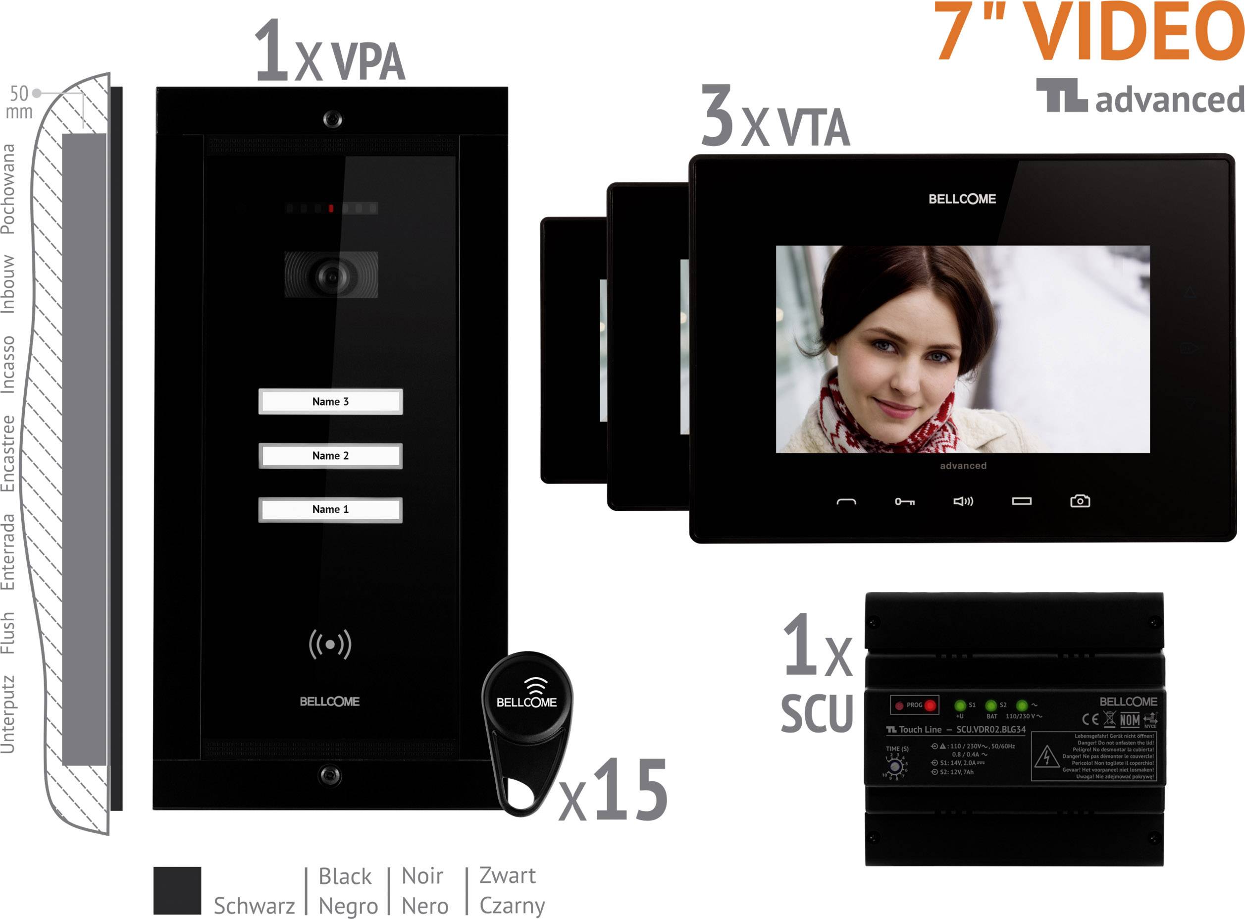 BELLCOME Advanced - Video-Türsprechanlage Komplettes KIT für 3 Familie, SCHWARZ, 4-Draht-Installation, abgehärteter Glasoberfläche und Touch-Tasten für Innen- und Außenbereich, integrierte ausrichtbare Videokamera und IR-Beleuchtung, beleuchteter Name, 7" (17,78 cm) TFT-LCD-Display , Vollduplex (ohne Handgerät), Unterputz Außeneinheit.