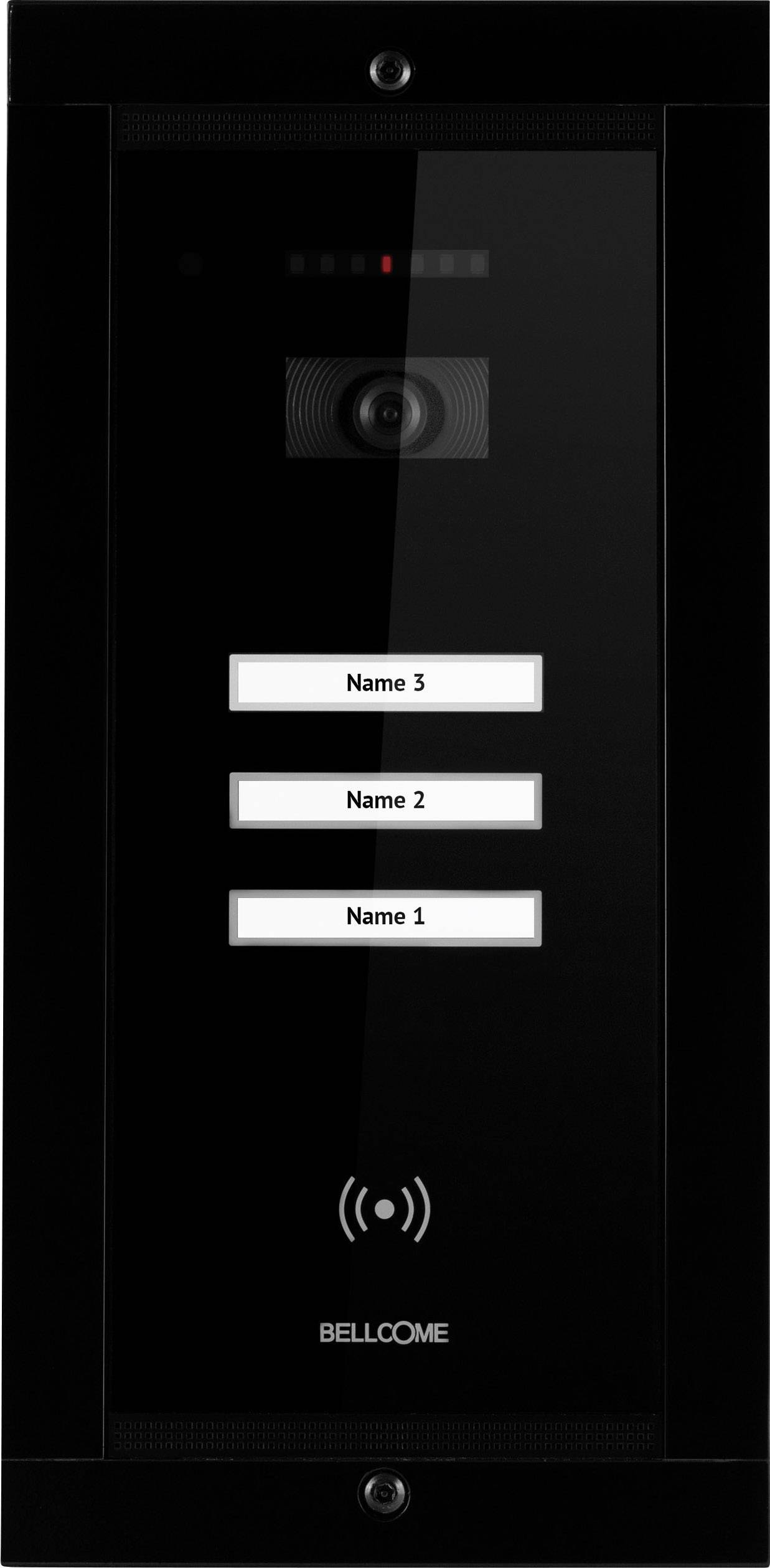BELLCOME Advanced Video Außeneinheit für 3 Familie, 4-Draht-Installation, SCHWARZ, 4 mm gehärtetes Glasgehäuse, ausrichtbare Videokamera mit 70 ° Sichtwinkel und ± 25 ° Ausrichtungswinkel, starke IR-Beleuchtung, hintergrundbeleuchtete TOUCH-Tastatur mit Namensanzeige, eingebauter RFID-Leser, Aufputzmontage, Anpassungsfähigkeit an die Architektur jedes Gebäudes, voller Schutz gegen Wasser und Staub, Kratz- und Stoßfestigkeit, benutzerfreundliche Bedienung und einfache Wartung.