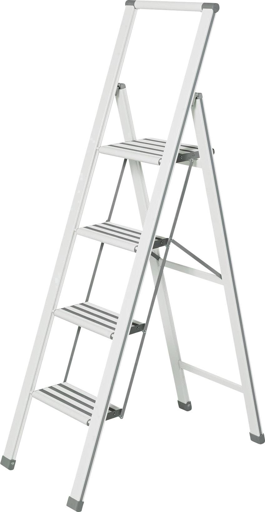 Für sicheren Halt bei alle Arbeiten, die in die Höhe gehen, sorgt die 4-stufige Alu-Design Trittleiter von WENKO. Egal ob beim Bilder und Gardinen aufhängen, Lampen montieren, Fenster putzen oder der Gartenarbeit, die innovative Leiter verspricht eine optimale Standsicherheit bei einer Standhöhe von 100 cm - kein unsicheres Balancieren und Wackeln mehr.