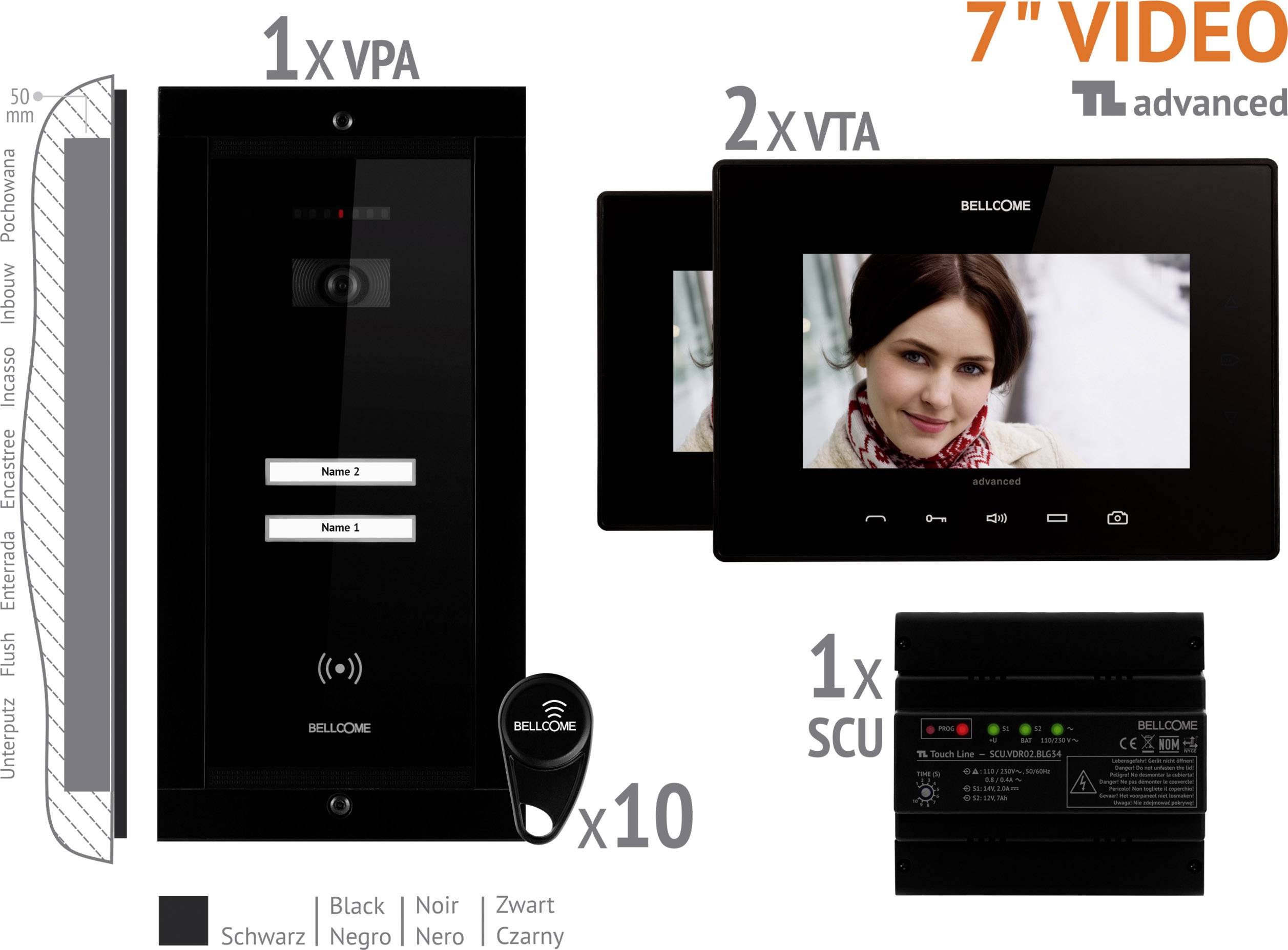 BELLCOME Advanced - Video-Türsprechanlage Komplettes KIT für 2 Familie, SCHWARZ, 4-Draht-Installation, abgehärteter Glasoberfläche und Touch-Tasten für Innen- und Außenbereich, integrierte ausrichtbare Videokamera und IR-Beleuchtung, beleuchteter Name, 7" (17,78 cm) TFT-LCD-Display , Vollduplex (ohne Handgerät), Unterputz Außeneinheit.