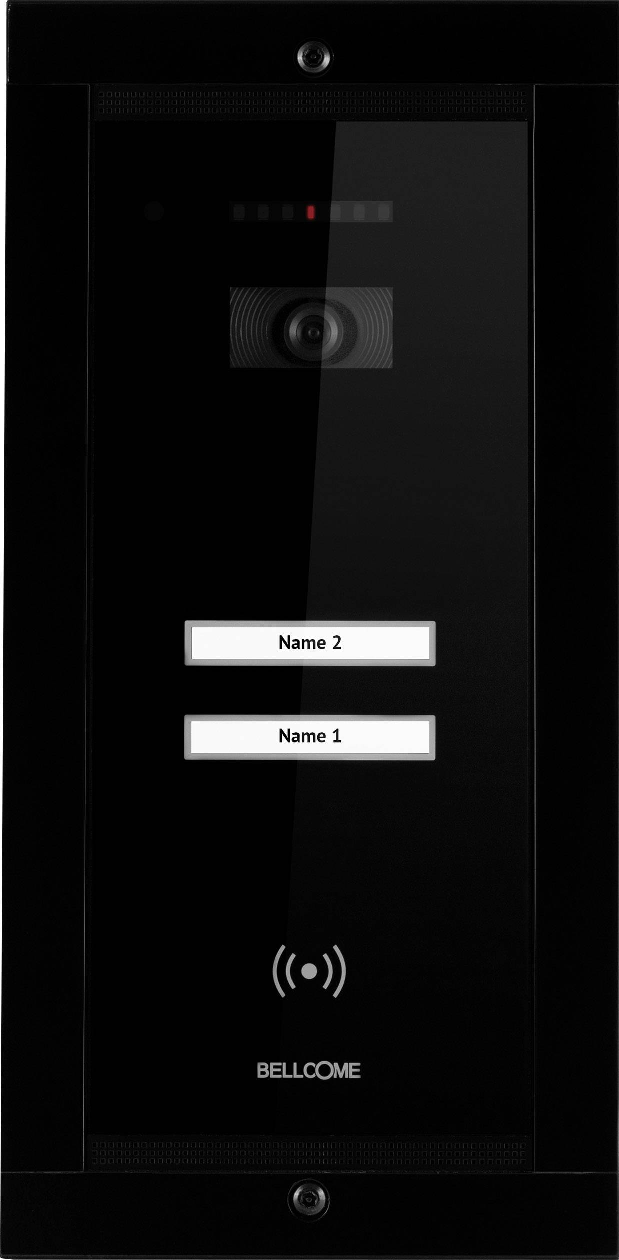 BELLCOME Advanced Video Außeneinheit für 2 Familie, 4-Draht-Installation, SCHWARZ, 4 mm gehärtetes Glasgehäuse, ausrichtbare Videokamera mit 70 ° Sichtwinkel und ± 25 ° Ausrichtungswinkel, starke IR-Beleuchtung, hintergrundbeleuchtete TOUCH-Tastatur mit Namensanzeige, eingebauter RFID-Leser, Aufputzmontage, Anpassungsfähigkeit an die Architektur jedes Gebäudes, voller Schutz gegen Wasser und Staub, Kratz- und Stoßfestigkeit, benutzerfreundliche Bedienung und einfache Wartung.