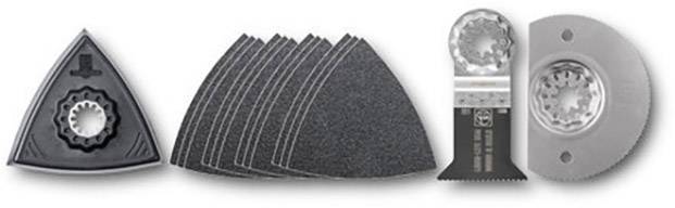 15-teiliges Zubehörset. Ideale Zubehör-Auswahl für alle häufig anfallenden Renovierungs- und Instandsetzungsarbeiten rund ums Haus. Universell einsetzbar zum randnahen Schleifen an Ecken und Kanten ohne Rückschlageffekt. Zum Sägen aller Holzmaterialen, auch mit Nägeln, oder speziell zum Sägen weicher Werkstoffe ohne Überschnitt bis in den Randbereich. Attraktiver Preisvorteil gegenüber Einzelbezug. Mit Starlock-Aufnahme passend für allen gängigen Oszillierer am Markt. Auch kompatibel zu Bosch, Makita, Metabo, Ridgid, Skil u.v.a..