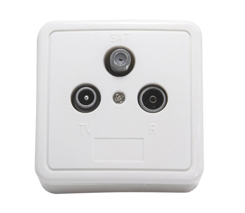 GAD 269 LTE - 3-Loch-Wandsteckdose für terrestrischen und Satellitenempfang Hauptmerkmale: Einzeldose zur Verwendung hinter dem Multischalter bzw. Abzweiger, LTE-geschützt im TV-Ausgang über 700 MHz, selektive Anschlüsse für TV, Radio und SAT, inklusive weißem Kunststoffrahmen und Abdeckplatte,
