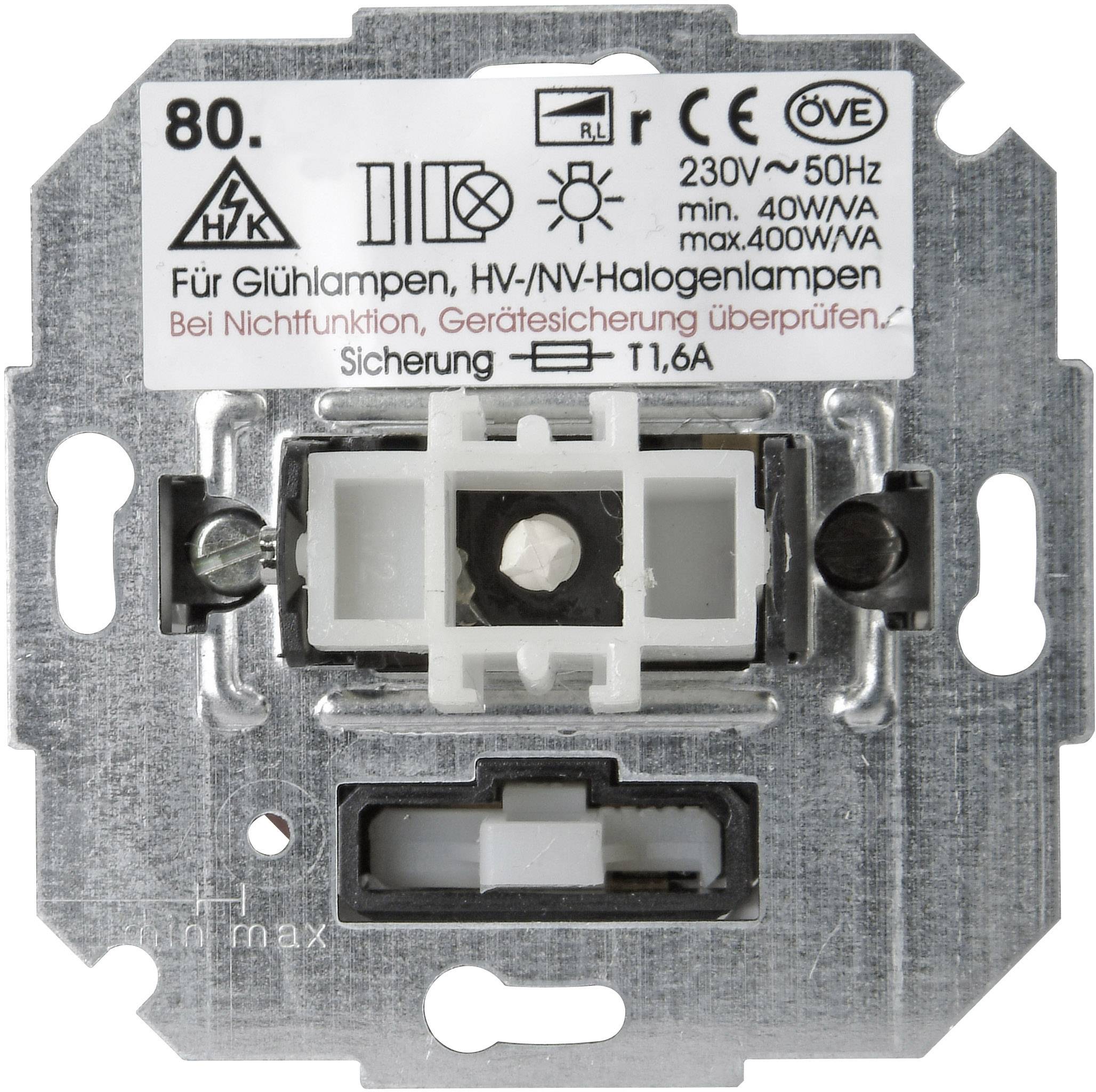 Unterputz Dimmer mit Wippen-Wechselschalter-(Phasenanschnitt) Sockel für Glüh-und 230V-Halogen-, sowie Niedervolt-Halogenlampen mit konventionellen Trafos. 40-400W/VA, 230V~, 50Hz, nicht für elektronische Trafos, technische Angaben der Trafo-Hersteller beachten.