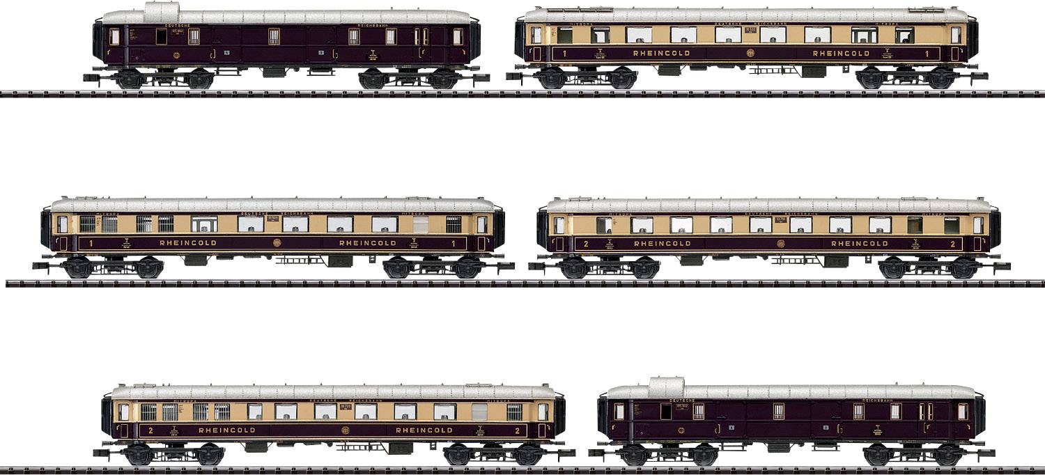 6 unterschiedliche Schnellzugwagen "Rheingold" der Deutschen Reichsbahn-Gesellschaft (DRG) in der Lackierung Anfang der 1930er Jahre. 1 Gepäckwagen SPw4ü-28, 1 Schnellzugwagen 2. Klasse mit Küche SB4ük-28, 1 Schnellzugwagen 1. Klasse ohne Küche SA4ü-28, 1 Schnellzugwagen 1. Klasse mit Küche SA4ük-28, 1 Schnellzugwagen 2. Klasse ohne Küche SB4ü-28 und 1 Gepäckwagen SPw4ü-28.