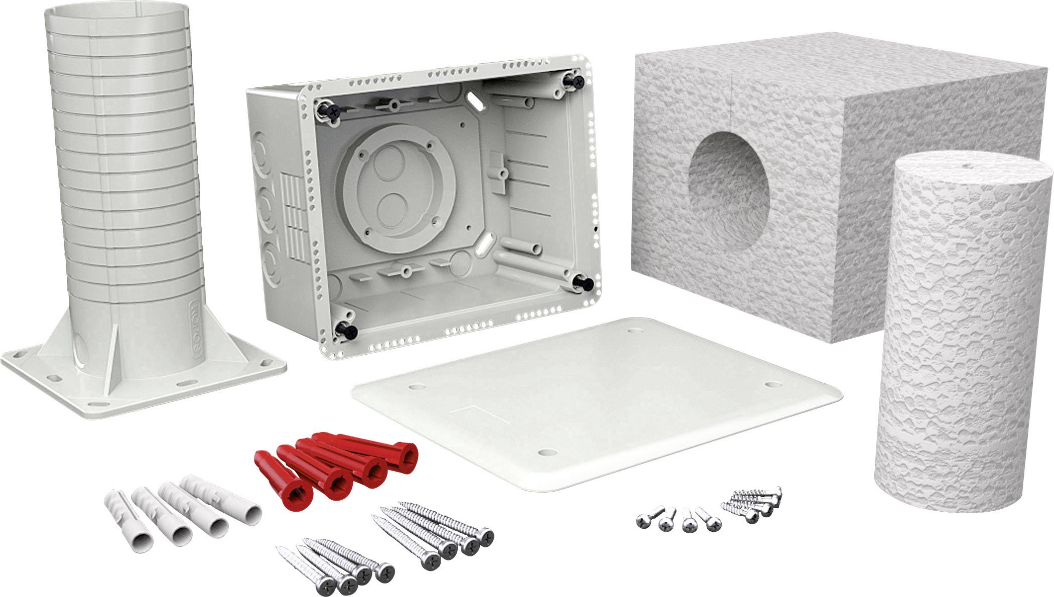 Dose mit festem Deckel V 180 + Verlängerungstubus + Außen- und Innendämmung + Montageset + Edelstahlschrauben.