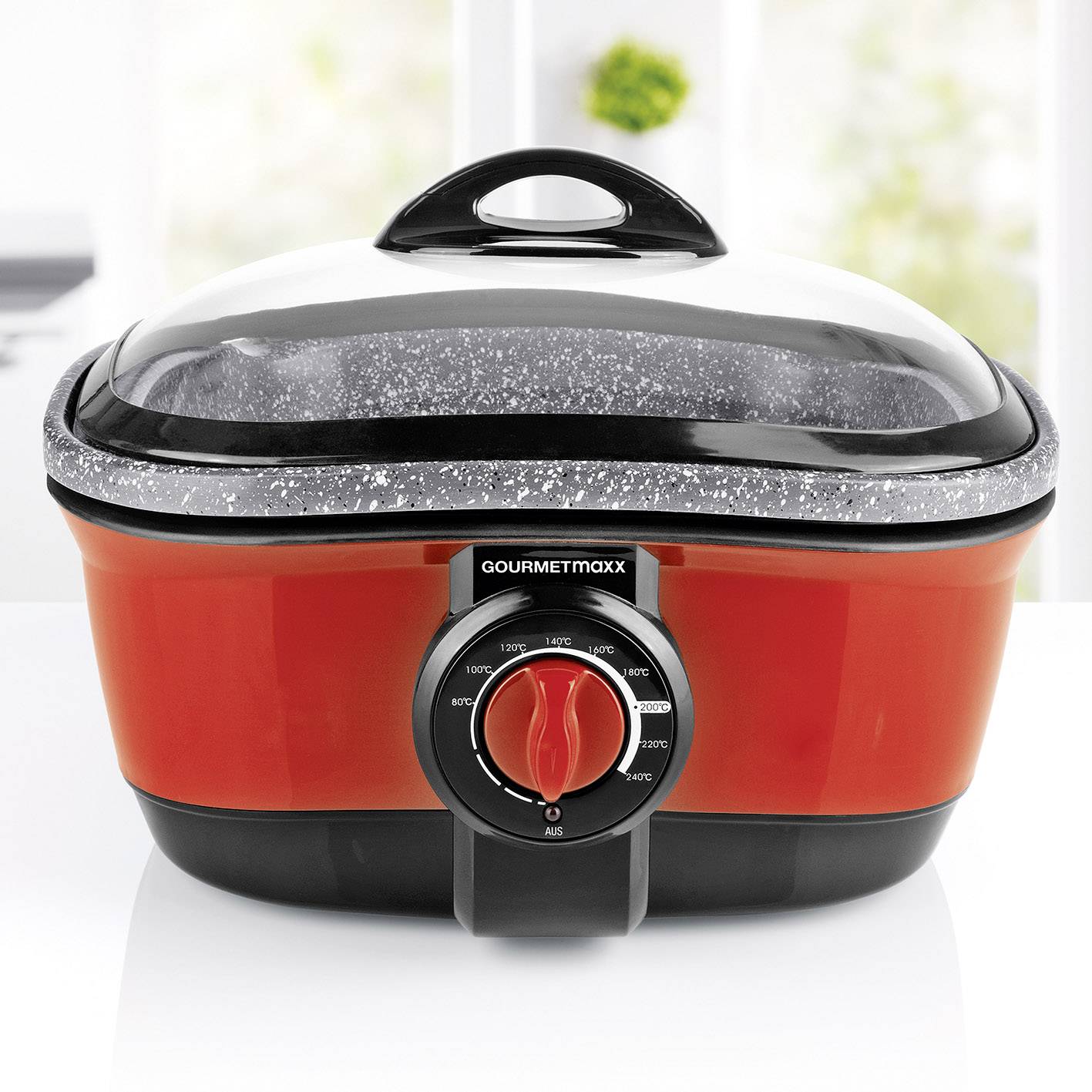 Mit diesem praktischen Allrounder haben Sie jetzt das passende Küchengerät für jeden Anlass! Der "GOURMETmaxx" Multifunktionskocher 8 in 1 ersetzt zahlreiche Küchengeräte und ist kaum größer als ein Kochtopf. Die Gartentemperatur lässt sich bei allen Funktionen stufenlos regulieren. Dabei brennt Ihnen dank der Antihaftbeschichtung in ansprechender Granit-Optik so schnell nichts an und nichts bleibt kleben oder haften! Auf zusätzliches Öl oder Fett können Sie nahezu verzichten. So ist auch die anschließende Reinigung ein Klacks.