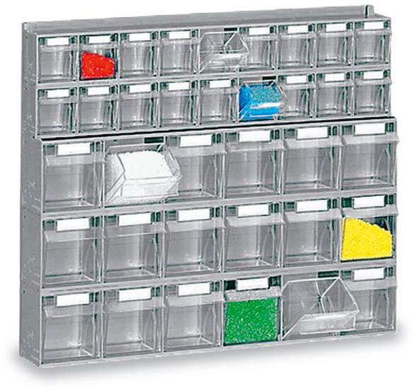 Klappkasten-Magazin - Komplettangebot inkl. Rückwandblech zur Wandbefestigung. Gehäusereihen: - Aus stabilem ABS-Kunststoff - Aufeinander stapelbar oder zur Wandmontage - Durch gleiche Breite ideal kombinierbar. Kästen: - Aus schlagzähem spezial Kunststoff - Klappbare und herausnehmbare Kästen für bequemes Befüllen und Entnehmen - Mit Griffleiste und Etikettierfeld. Bestückung: - 2 Reihen je 9 x Gr. 1 - 3 Reihen je 6 x Gr. 2. Kastenmaße T x B x H Gr. 1: 44 x 59 x 65/49 mm Gr. 2: 66 x 87 x 100/72 mm Gr. 3: 100 x 113 x 150/110 mm Gr. 4: 130 x 142 x 194/135 mm Gr. 5: 146 x 190 x 225/164 mm Gr. 6: 219 x 285 x 337/246 mm Lieferumfang: - Inkl. Befestigungsmaterial.