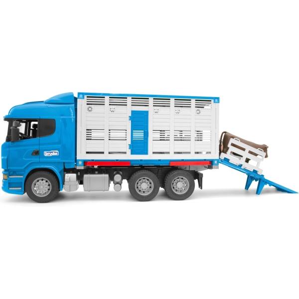 Artikelcharakteristika: Fahrerhaus: klappbare Außenspiegel - Frontscheibe aus transparentem und bruchsicherem Kunststoff - Türen zum Öffnen Aufbau: zerlegbarer Container in alle Einzelteile - Container durch Verbindungssystem untereinander kombinierbar - ausklappbare Stützfüsse - klappbare Rampe incl. Rampenverlängerung - seitlich klappbare Rampengatter - 2 Seitentüren zum Öffnen - umklappbares Trenngatter im Inneren - 2 Tränken zum Einhängen in die Seitenwände - 1 Rind im Lieferumfang enthalten (Kühe und Bullen sind separat erhältlich Art.-Nr.: 02308 & 02309) Weiteres: zur Spielergänzung ausstattbar mit Light & Sound Module, Art.-Nr.: 02801 (nicht im Lieferumfang enthalten) Allgemein: Altersempfehlung: ab 4 Jahren zum Spielen für Innen und Außen geeignet - hergestellt aus hochwertigen Kunststoffen wie z.B. ABS - Kompatibel mit Figur - Maßstab 1:16 Artikelbeschreibung: Die Scania R-Serie ist ein Synonym für Wirtschaftlichkeit und Dynamik. Als hochmoderner Tiertransporter übernimmt er alle, in der Landwirtschaft anfallenden Transportaufgaben. Dafür enthält der LKW alles, was für den art- bzw. tiergerechten Transport heute gefordert wird: Verletzungsfreies Be- und Entladen der Tiere durch eine klappbare, verlängerbare Rampe mit Rampengattern zum Hochklappen, umklappbare Innentrenngatter um dem Platzbedarf der verschiedenen Arten/ Rassen gerecht zu werden, einhängbare Tränken usw. Ein maßstabsgetreues Rind liegt dem Fahrzeug bei, zusätzliche Kühe, und Bullen werden unter Artikelnummer 02308 und 02309 angeboten. Das Fahrerhaus zeigt das Scania typische, dynamische Design. Klappbare Außenspiegel, sowie eine Verglasung aus hochwertigem Kunststoff sind selbstverständlich genauso vorhanden, wie Türen zum Öffnen oder eine Ergänzungsmöglichkeit für ein Light & Sound Module.