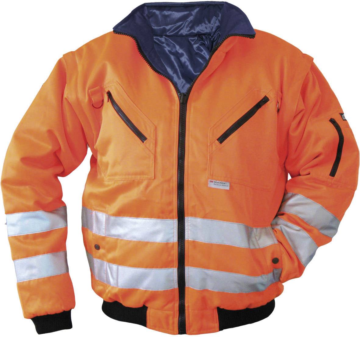 Wendbare 4-in-1-Warnschutz-Pilotenjacke mit Reflexstreifen · Heraustrennbaren Ärmeln und Strickbund an Armen und Bund · Außenseite leuchtorange · Wendbare Seite dunkelblau · 1 Brusttasche je Seite · 1 seitliche Einschubtasche je Seite · 1 Ärmeltasche.