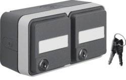 Steckdose 2fach waagerecht mit Klappdeckel - Beschriftungsfeld - Schloss - erhöhter Berührungsschutz, mit Schloss - ungleiche Schließungen. Für z.B. Waschmaschine und Trockner, mit 4 gleichen Schlüsseln. Für waagerechte Montage, mit 2 Leitungseinführungen, 2 zusätzliche seitliche